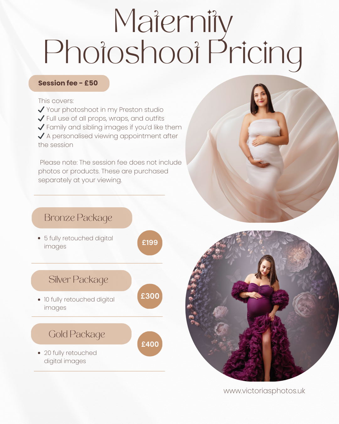 To book your maternity photography session in Preston, there is a £50 session fee.